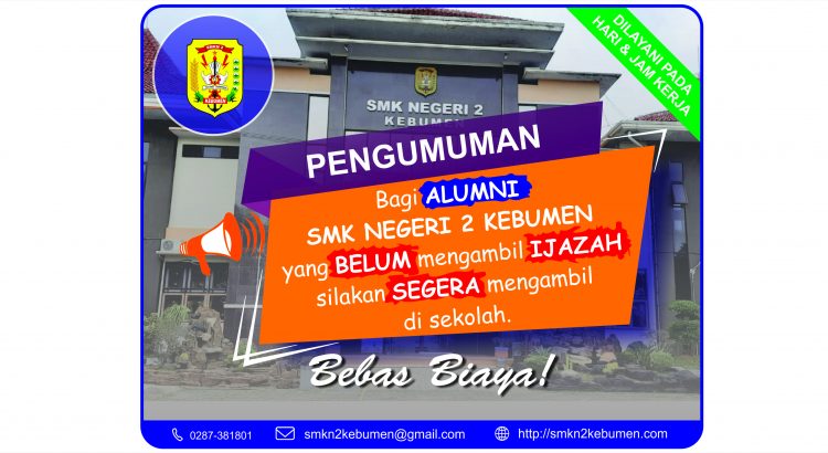 Diberitahukan Kepada Alumni SMK Negeri 2 Kebumen yang belum mengambil Ijazah untuk segera mengambil di kampus SMKN 2 Kebumen pada hari dan jam kerja.