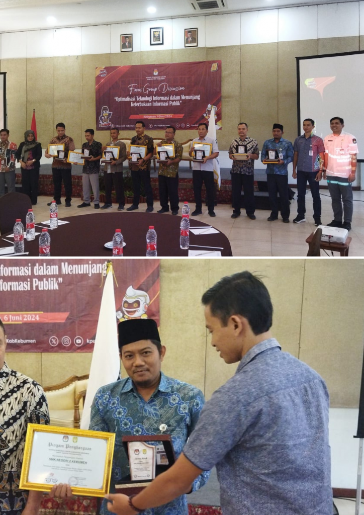 Kepala SMK Negeri 2 Kebumen Bapak Nurul Aini, S.Pd., M.Pd. yang diwakili oleh Wakil Kepala Sekolah Bidang Kesiswaan Beliau Bapak Akhmad Arifin, S.Pd. menghadiri undangan dari Komisi Pemilihan Umum Kabupaten Kebumen nomor : 344/PP.04.2-Und/3305/2024 dengan tema kegiatan focus Group Discussion dengan tema “Optimalisasi Teknologi Informasi dalam Menunjang Keterbukaan Informasi Publik” yang dilaksanakan pada Kamis, 6 Juni 2024 tempat di hotel Mexolie Kebumen. SMK Negeri 2 Kebumen Mendapatkan penghargaan Partisipasi Aktif dalam Pembentukan Badan Adhoc (PPK-PPS) Pemilihan Umum Tahun 2024.